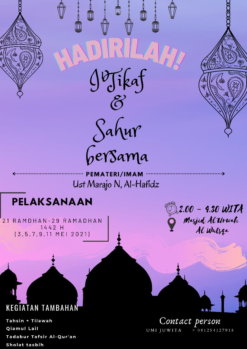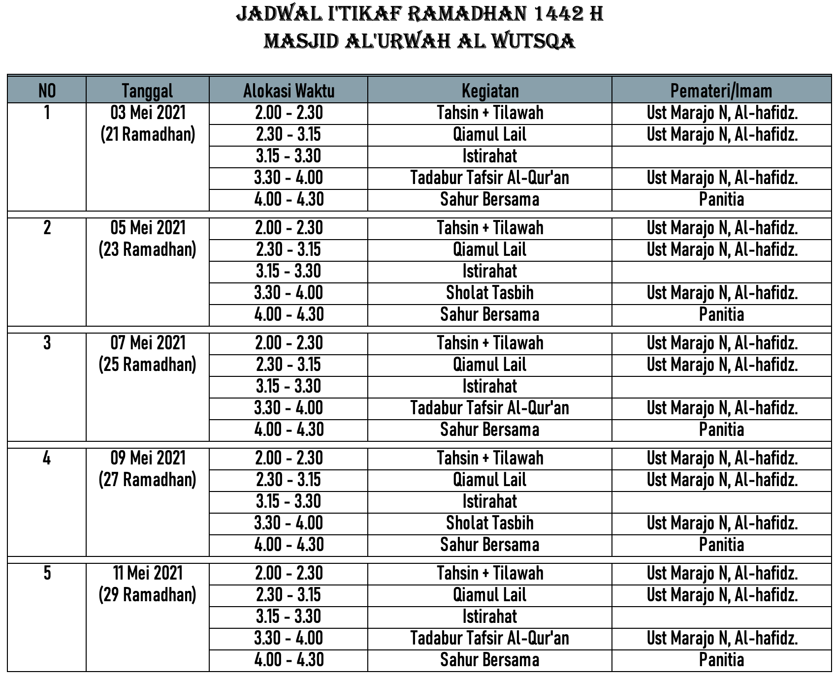 Jadwal kegiatan i’tikaf akan dimulai pada 21-29 Ramadhan 1442 H atau pada tanggal 3, 5, 7, 9, 11 Mei 2021 bertempat di masjid Al ‘Urwah Al Wutsqa.